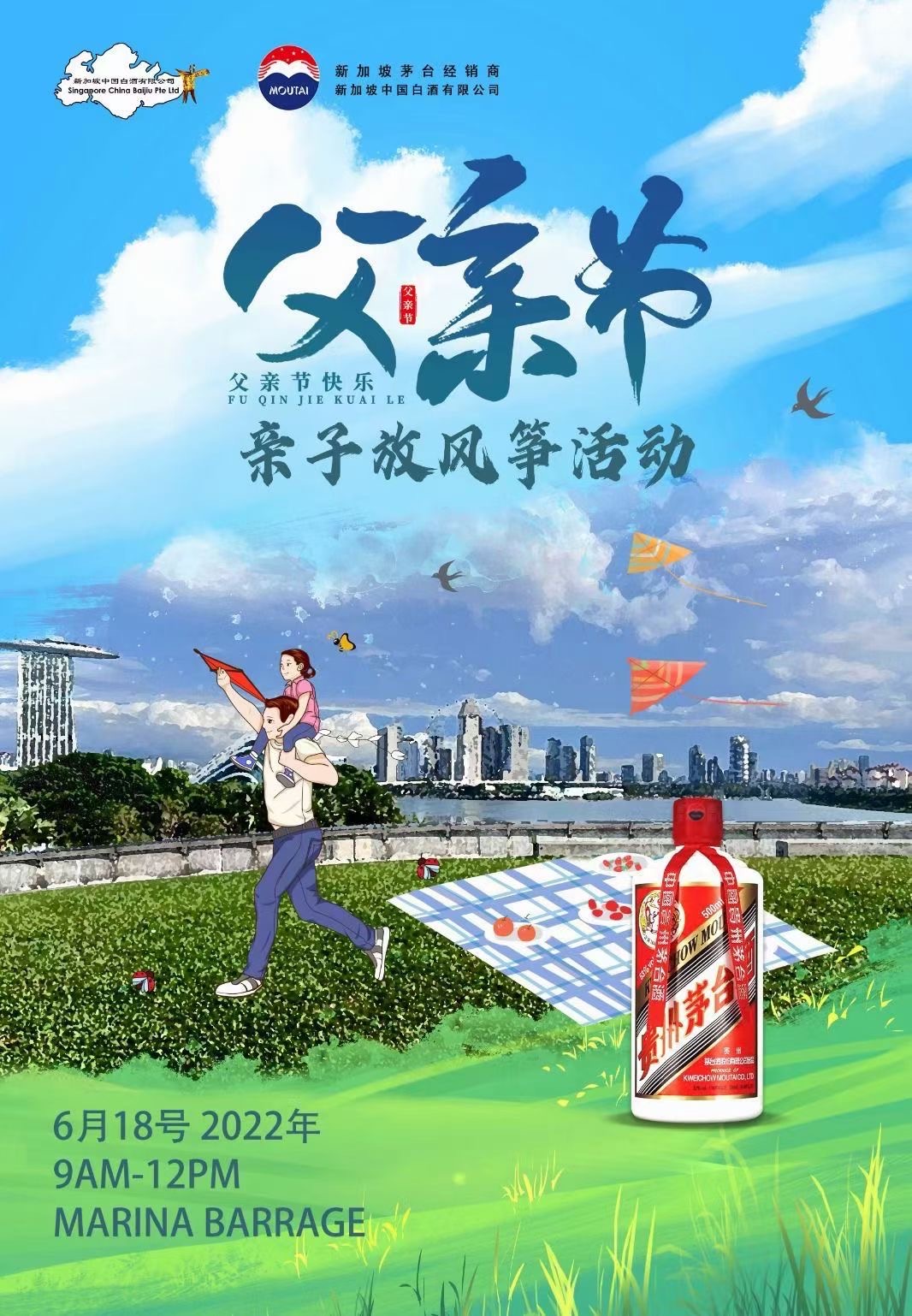 To celebrate Father’s Day with an awesome day of fun activities for Dad and the whole family, Singapore China Baijiu Pte Ltd and Singapore Mountai has organised a kite flying event at Marina Barrage. Besides rediscovering the joy of kite flying, this activity also provided an opportunity to let the child and the father open their hearts, spend time together and dedicate a different kind of love to the father.