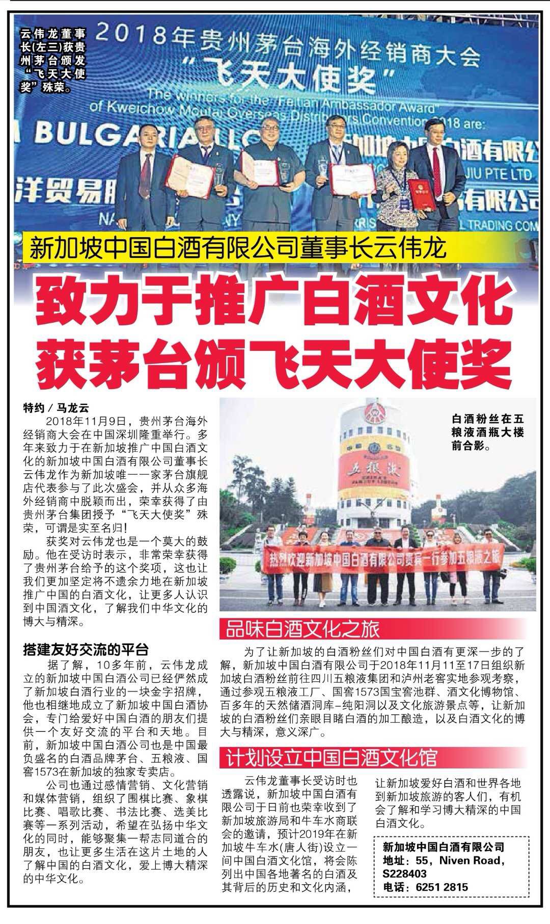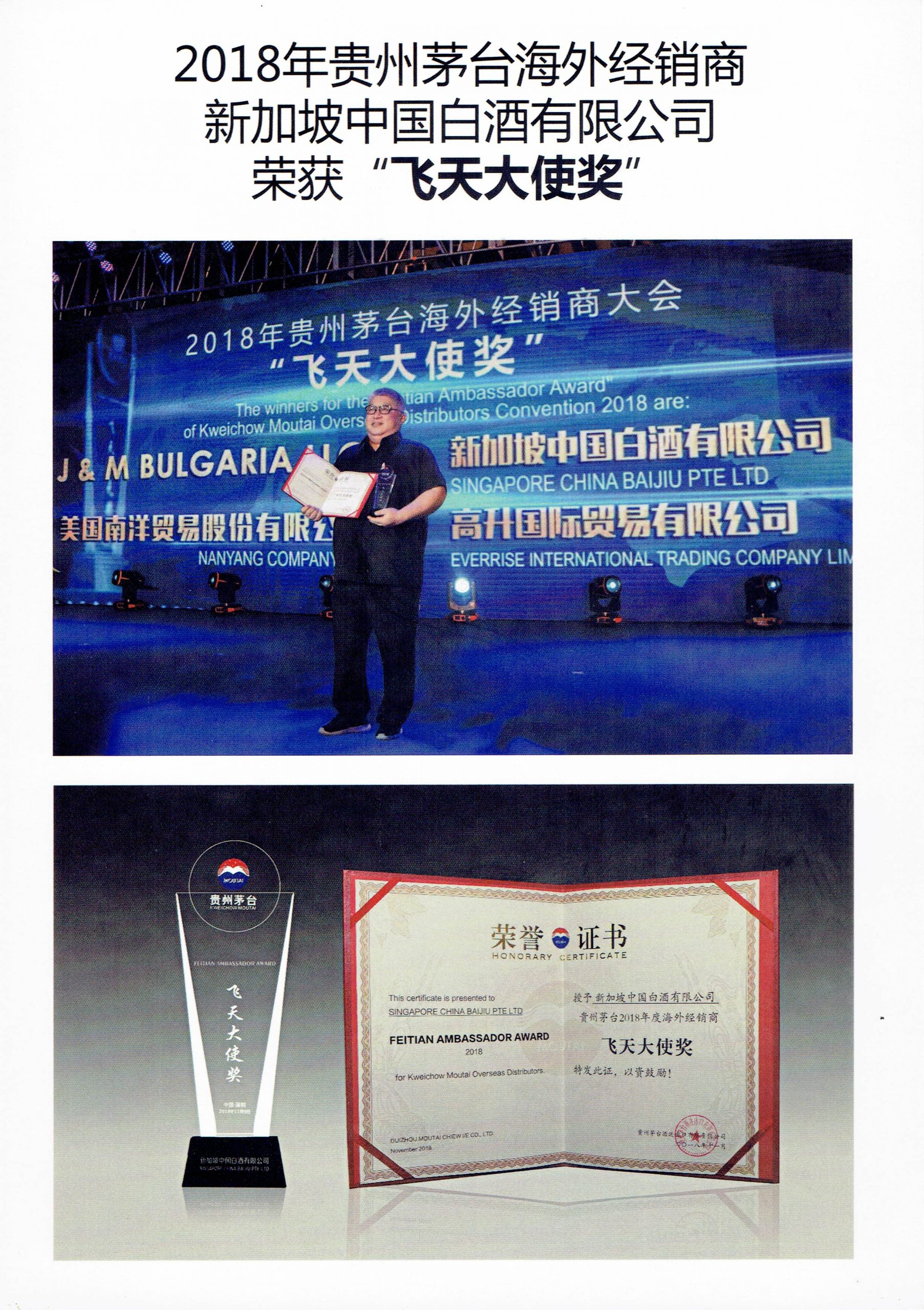 Awarded the 2018 “Flying Ambassador Award” by Kweichow Moutai Co Ltd – Singapore China Baijiu Pte Ltd