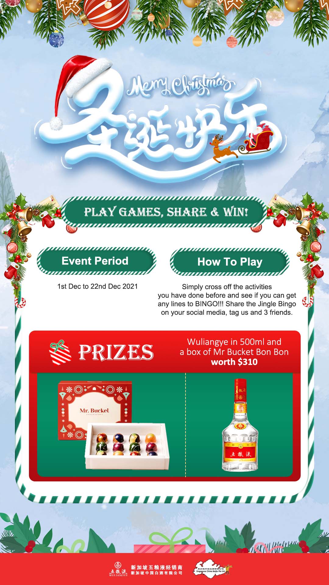 Our Christmas gift box consists of a bottle of premium Chinese baijiu – Wuliangye in 500ml (RTP: $268) and a box of 12 Mr Bucket Festive Bon Bon chocolates (RTP: $41), total worth of $310!